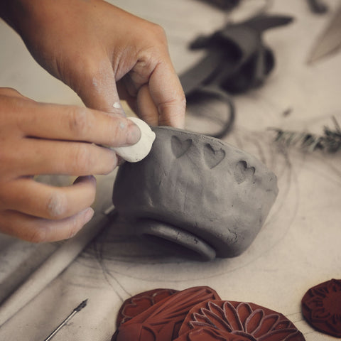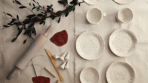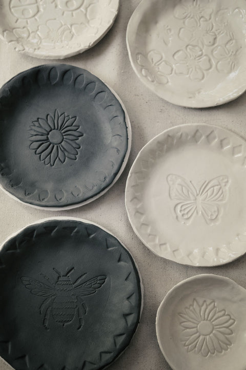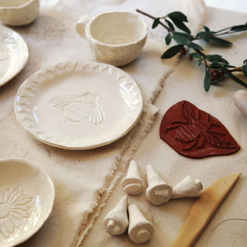 Create elegant clay plates with nature-inspired stamp motifs. In your first visit, you'll learn how to hand-build your very own plates using clay and create patterns using clay stamps. Then, come back for a second session to add glazes.