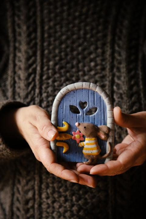 You’ll sculpt your own tiny clay fairy mouse door by hand — carve the little details, add a doorknob, a window, maybe some tiny vines if you like — and then come back 14 days later to glaze* (aka. paint) the mouse door once it’s been kiln-fired.